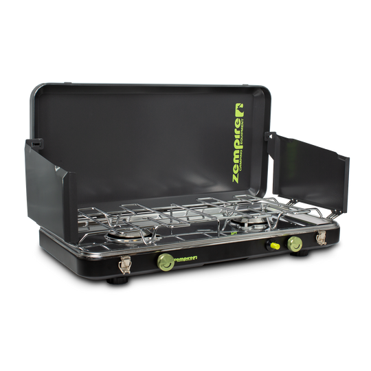The 2 Burner Deluxe is a portable and easy-to-use camping stove. The drop-down toaster is perfect for breakfast time and can be folded away when not needed, while the stainless steel drip tray makes clean up easy. The no-fuss suitcase design packs down small and features a wrap-around windshield and locking legs that create a stable platform on most surfaces.