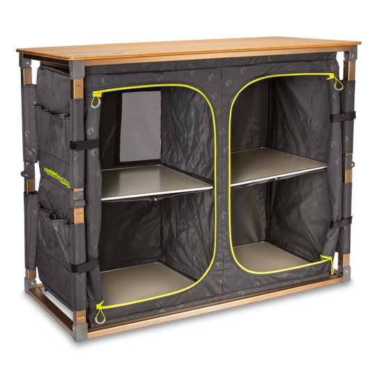 The Eco Fold Twin V2 features a naturally weatherproof and heat-resistant bamboo tabletop and rustproof aluminium frame. A perfect working surface to cook and prepare camp meals. The twin lower cupboards, along with side storage pockets, help to help keep your campsite organised. A retractable utility rack keeps utensils close at hand and can also store a basin for wash-up.